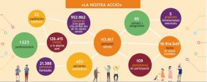 Durant el 2018 hem atès a 113.817 persones, això representa un 17,5% més que al 2017. Aquesta tasca ha estat possible gràcies a la feina de 1.523 professionals i de 453 persones voluntàries. Tanmateix, és una satisfacció constatar com continua creixent la projecció de l’entitat amb més de 120.000 visites a la pàgina web i amb prop d’un milió de persones a les quals hem arribat des de les xarxes socials.