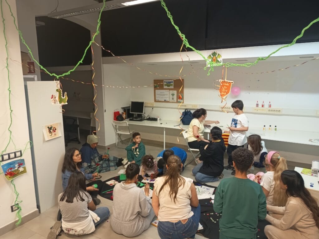 Altres programes també van celebrar la Diada, com el programa de l’àrea d’inclusió i pobresa de la Botiga de Comunitat Activa Sants, que va acollir un taller adreçat a infants i famílies amb l’objectiu de fomentar la creativitat i l’amor per la lectura. Els nens i nenes van participar en activitats manuals, van pintar dibuixos i van gaudir de contes en un espai pensat per reforçar els vincles familiars. La jornada es va completar amb la projecció d’un vídeo sobre la llegenda de Sant Jordi, apropant la tradició als més petits. També el programa de l’àrea d’infància i famílies de l’Espai Familiar Preinfant va celebrar la Diada amb un recorregut per les paradetes d’ABD, així com als Pisos Maternoinfantils, amb un taller de manualitats per als més petits i les seves mares.