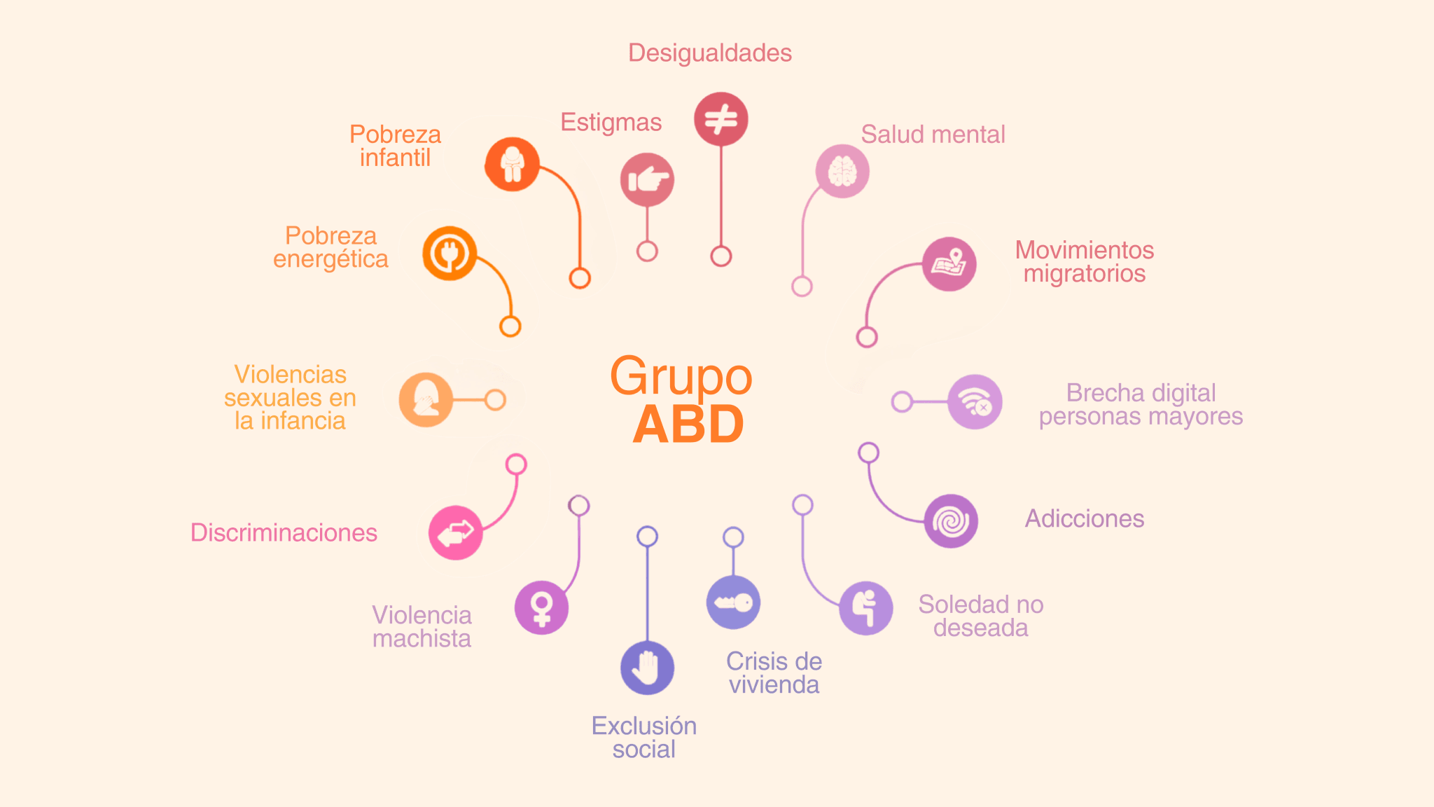 El Grup ABD està format per l’Associació Benestar i Desenvolupament, Fundació Acció, Benestar i Desenvolupament, Institut Genus, S.L., UTE CAS Prat i UTE Pobresa Energètica