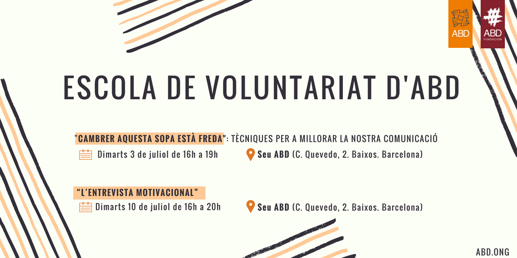 Ets voluntari/a i estàs interessat en adquirir eines per treballar processos de canvi amb usuaris/àries?. Ets voluntari/a i vols millorar les teves competències comunicatives?. Si la resposta és afirmativa no et perdis els cursos que tenim previstos a l’Escola de Formació del Voluntariat d’ABD per al proper mes de juliol.