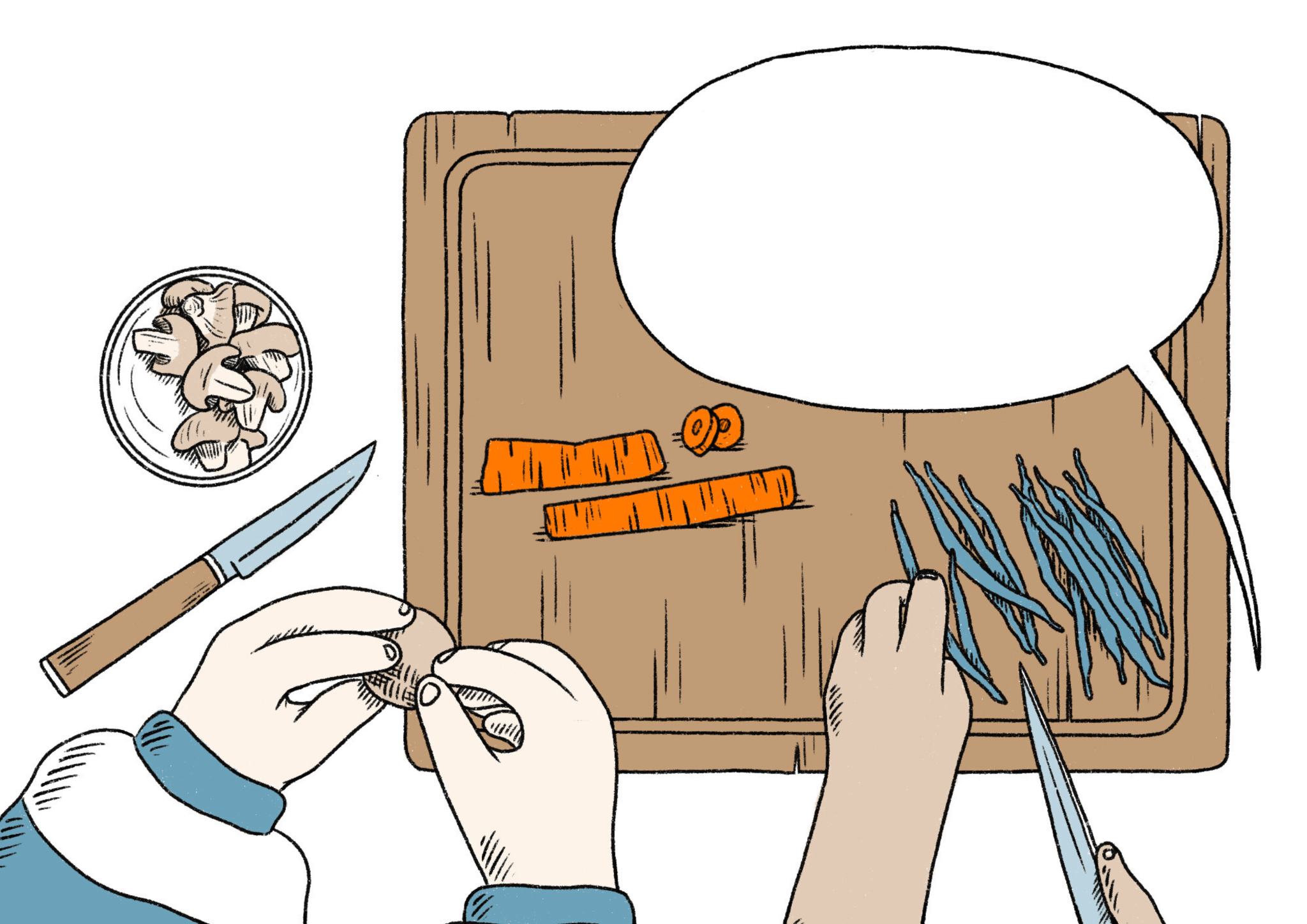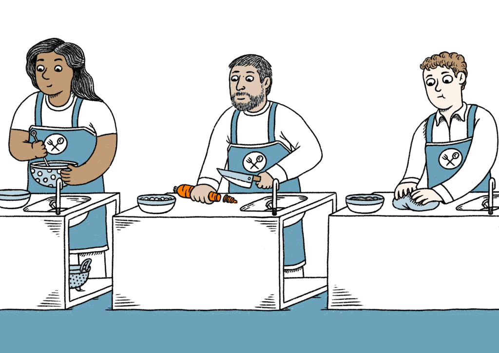 Luego llega el día de la visita. A veces Joan y una de las personas usuarias van a hacer algunas compras para completar el menú y luego vuelven a CAMS a cocinar.
